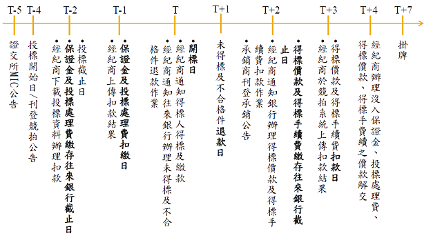 第九天(T+4日):經紀商解交實際扣繳之得標手續費、得標價款、投標處理費及沒入保證金(匯入證交所)。