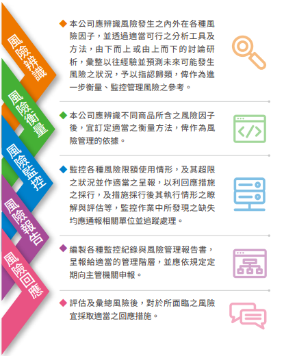 | 風險管理室 | 直接隸屬董事會,負責相關風險管理機制之規劃與設計、風險胃納與資本配置及風險衡量工具之評估,並對各項風險控管作業之審查、整合與監控等,定期向高階管理階層、風險管理委員會及董事會報告。 |